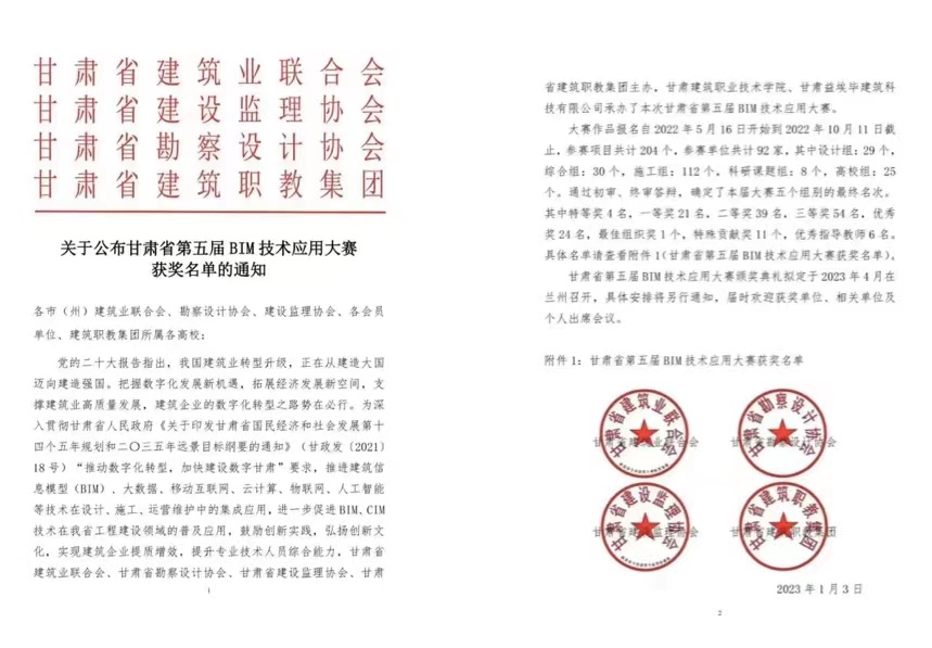 日前,,,,,甘肃省第五届BIM手艺应用大赛效果宣布,,,,,甘肃yl6776永利集团集团共获得14个奖项,,,,,其中,,,,,“BIM手艺在东乡县沿洮河经济带棚户区刷新二期(调解)项目设计阶段的应用”等8个项目划分获设计组一、二、三等奖,,,,,“同心抗疫,,,,,智慧制作—甘肃省疾病预防控制中心公共卫生中心项目BIM综合应用”等3个项目划分获综合组特等奖及一、二等奖,,,,,“数字化转型配景下的勘探设计企业BIM手艺推广路径探讨”等2个项目划分获科研课题组二、三等奖,,,,,修建设计院获特殊孝顺奖。。