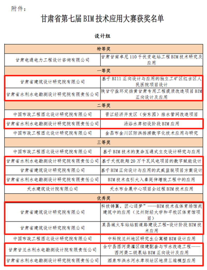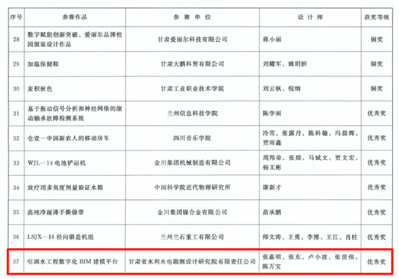 在甘肃省第七届BIM手艺应用大赛中,,,,修建设计院、水电设计院报送的项目共斩获12项奖励,,,,包办了设计组16个奖项中的10项。。在甘肃省第五届“立异杯”工业设计大赛中,,,,水电设计院《引调水工程数字化BIM建模平台》项目获优异奖。。在第十七届全省职工优异手艺立异效果奖中,,,,水电设计院、土木匠程院申报的两个项目分获立异效果奖三等奖,,,,其中,,,,《弃渣场三维设计平台》项目是全省水利系统唯一获奖效果。。