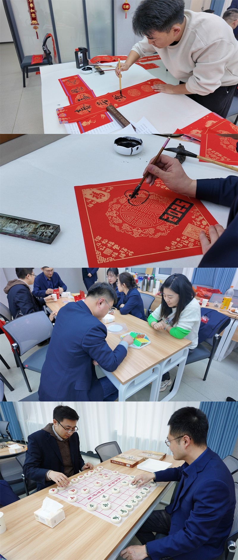 棋牌类游戏区,,博弈双方凝思屏气、见招拆招、运筹帷幄、乐在“棋”中。。春联福字区,,长桌排开、翰墨飘香,,喜迎新春的气氛扑面而来。。一声声叫好、一副副春联、一个个“福”字,,承载着各人对新年的优美期盼与祝福。。