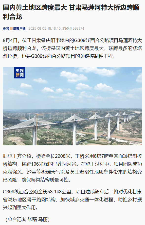 甘肃yl6776永利集团集团监理项目取得重大突破:海内黄土地区跨度最大 甘肃马莲河特大桥边跨顺遂合龙