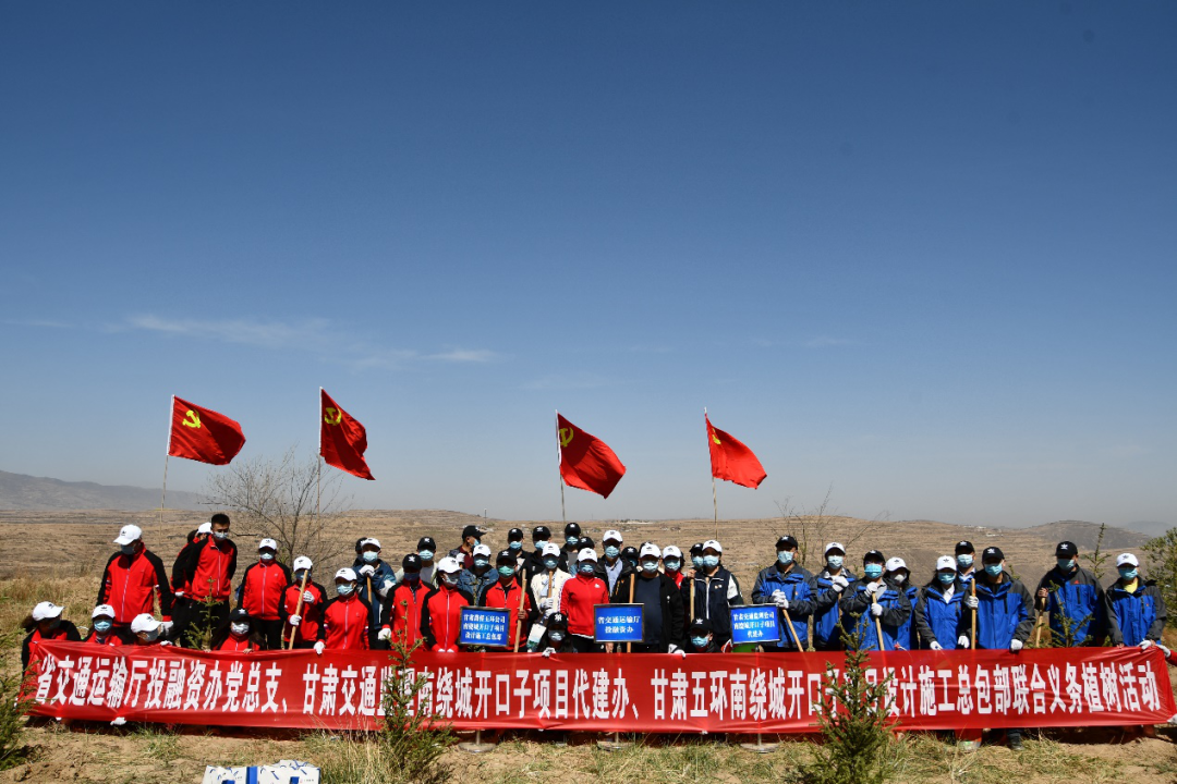克日,,,,,甘肃省交通工程建设监理有限公司机关第二党支部联合省交通运输厅投融资治理办公室党总支、甘肃五环公路工程有限公司党总支在甘肃青年生态修复林开展结对共建义务植树运动。。。。。省交通运输厅投融资治理办公室党总支、交通监理公司、甘肃五环公路工程有限公司50余名党员向导干部加入运动。。。。。