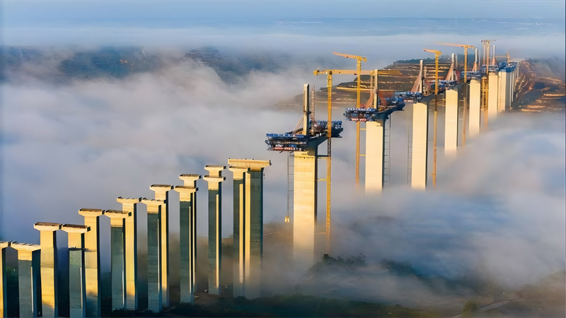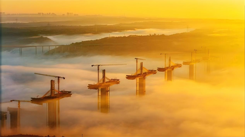 晨光初现,,,建设中的桥梁在薄雾中若隐若现,,,跨越河流、毗连两岸,,,为陇东大地经济腾飞插上同党。。。。
