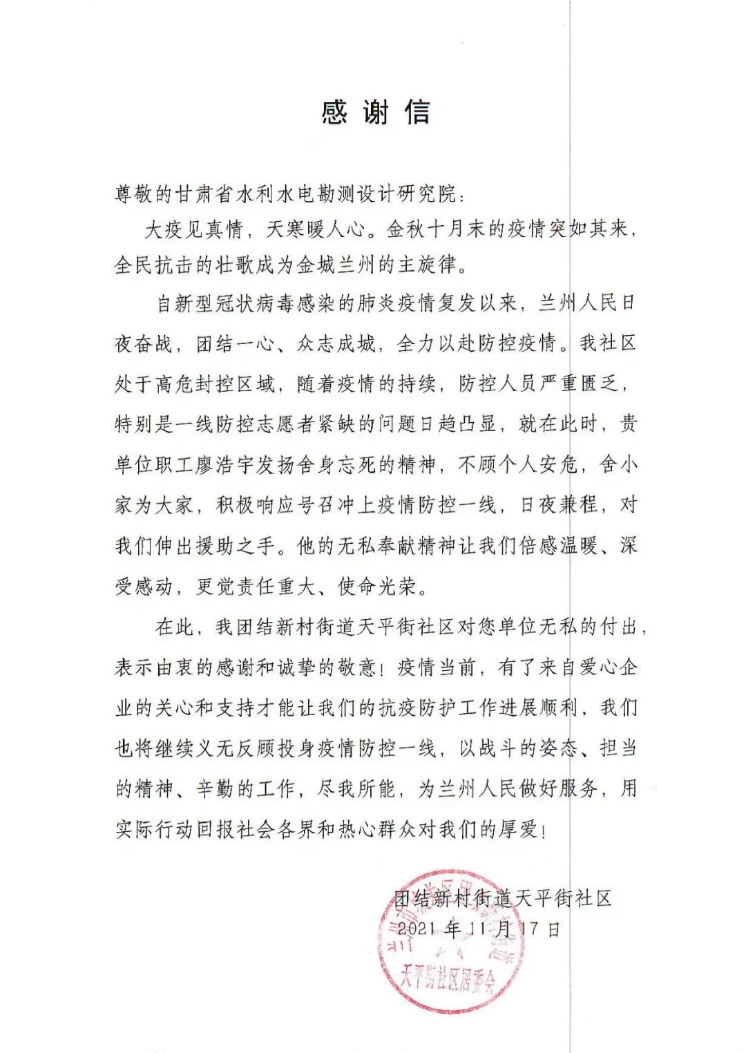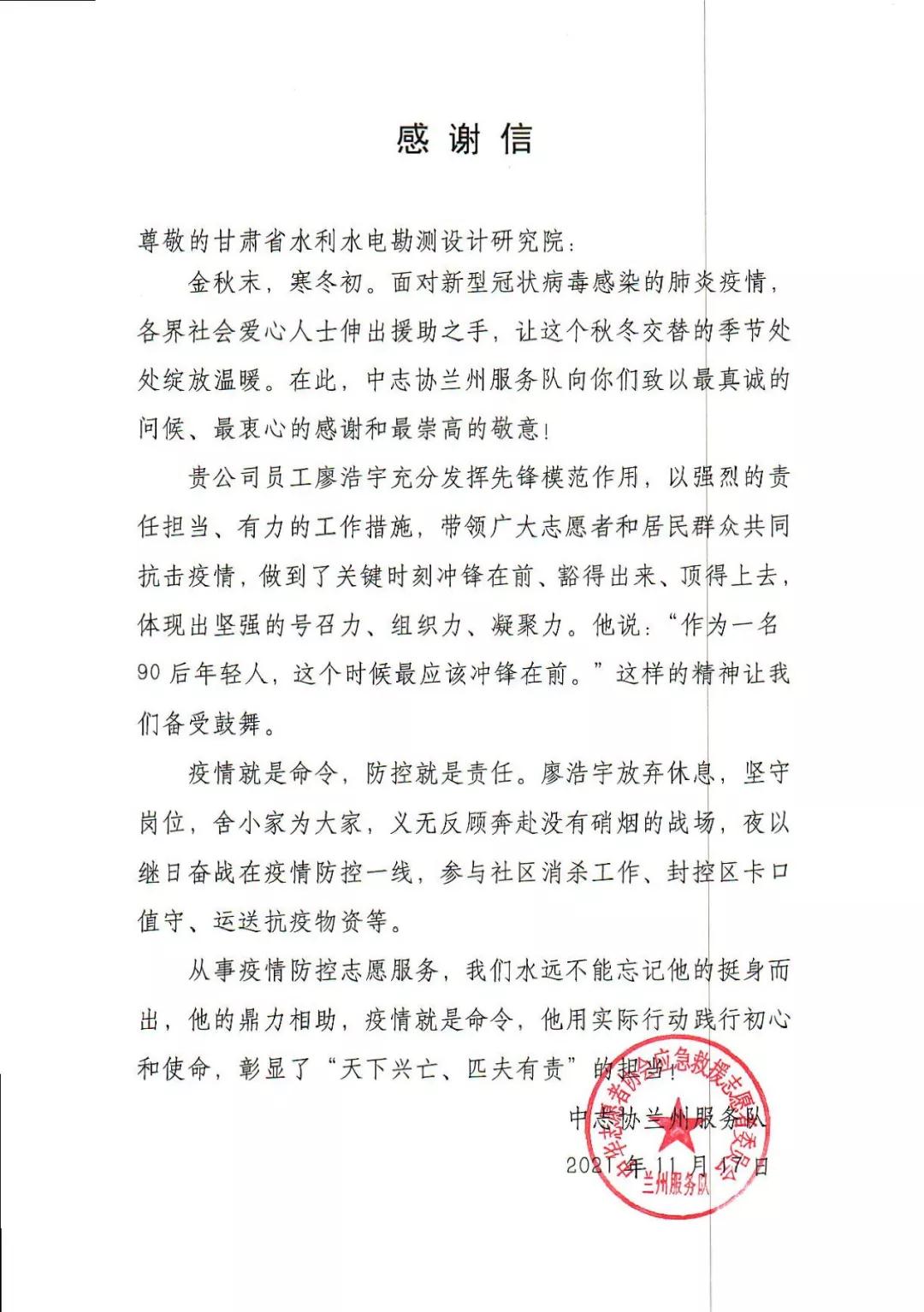 克日,,,水电设计院收到中志协兰州效劳队和团结新村街道天平街社区发来的谢谢信。。。。信中对水电设计院妄想院员工廖浩宇在此次疫情爆发后,,,自动请缨加入疫情防控效劳事情,,,甘当疫情防控最美逆行者,,,一连坚持26天自愿者效劳的先进事迹体现谢谢。。。。