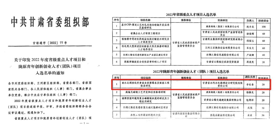 克日,,省委组织部印发了《2022年度省级重点人才项目和陇原青年立异创业人才(团队)项目入选名单》,,甘肃省水利水电勘探设计研究院有限责任公司申报的《南水北调西线甘肃省水资源需求及配套工程系统研究》乐成入选“2022年陇原青年立异创业人才(团队)项目”,,是集团公司唯一入选项目。。