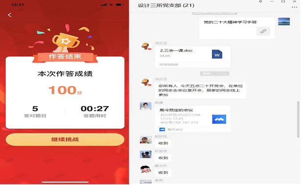 富厚载体,,,,营造浓重学习气氛。。。。各下层党支部通过开展“三会一课”,,,,转发主流媒体报道,,,,分享学习向导资料,,,,线上线下指导党员通过起劲加入整体学习、线上答题、视频学习等形式,,,,拓宽学习渠道,,,,富厚学习载体,,,,全方位、深条理、多途径开展党的二十大精神学习宣传事情,,,,多措并举营造学习党的二十大精神的浓重气氛。。。。
