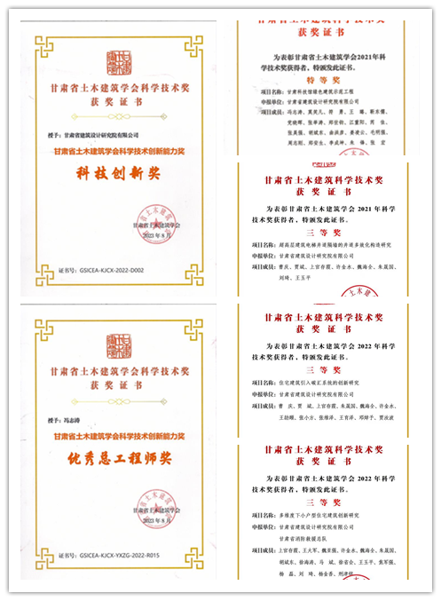 克日,,,,从甘肃省建设行业科技立异效果钻研会暨颁奖仪式上传来喜讯:省修建设计院被授予“科技立异奖”,,,,设计的甘肃科技馆荣获“绿色修建树模工程特等奖”,,,,开展的“住宅修建引入碳汇系统的立异研究”“多维度下小户型住宅修建立异研究”“超高层修建电梯井道隔墙的井道多效化结构研究”等研究荣获“2022年科学手艺奖三等奖”;;;冯志涛荣获“优异总工程师奖”,,,,上官存霞等8人划分获得“第四届中西部地区土木匠程师(修建师)”“科技孝顺奖”“科技英才奖”。。。
