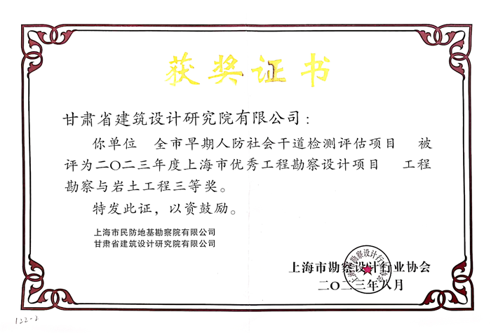 克日,,,上海市勘探设计行业协会宣布了2023年度上海市优异工程勘探设计项目奖评奖效果,,,省修建设计院检测中心提交的“全市早期人防社会干道检测评估项目”荣获2023年度上海市优异工程勘探设计项目工程勘探与岩土工程三等奖。。。。。
