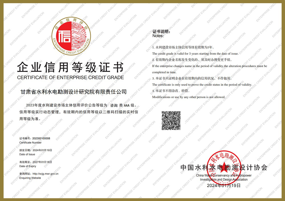 克日,,,,中国水利工程协会、中国水利水电勘探设计协会和中国水利企业协会联合宣布了《关于2023年度水利建设市场主体信用评价效果的通告》和《天下水利水电勘探设计行业信用评价效果的通告》,,,,省水电设计院勘探、设计、咨询、水资源论证、水文水资源视察评价、水土坚持计划体例等6个专业均获得响应评价标准的最高品级。。其中,,,,勘探、设计、咨询获AAA,,,,水资源论证、水文水资源视察评价、水土坚持计划体例获AAA+。。