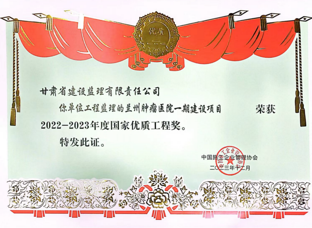 克日,,经中国施工企业治理协会评审,,省建设监理公司监理的兰州肿瘤医院一期建设项目荣获2022-2023年度国家优质工程奖。。。。此前,,该项目已先后荣获甘肃省建设工程文明工地、2021-2022年度甘肃省建设工程飞天奖、2022-2023年度国家优质工程奖。。。。