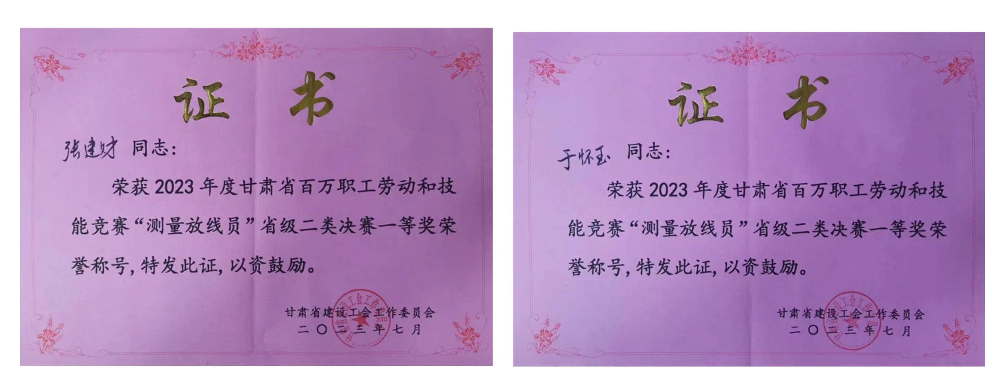 克日,,,从省建设工会“2023年度甘肃省百万职工劳动和手艺竞赛”组委会传来好新闻,,,省修建设计院选派的岩土手艺中心、岩土工程公司张建财和于怀玉两名同志,,,荣获2023年度甘肃省百万职工劳动和手艺竞赛“丈量放线员”省级二类决赛一等奖声誉称呼。。。